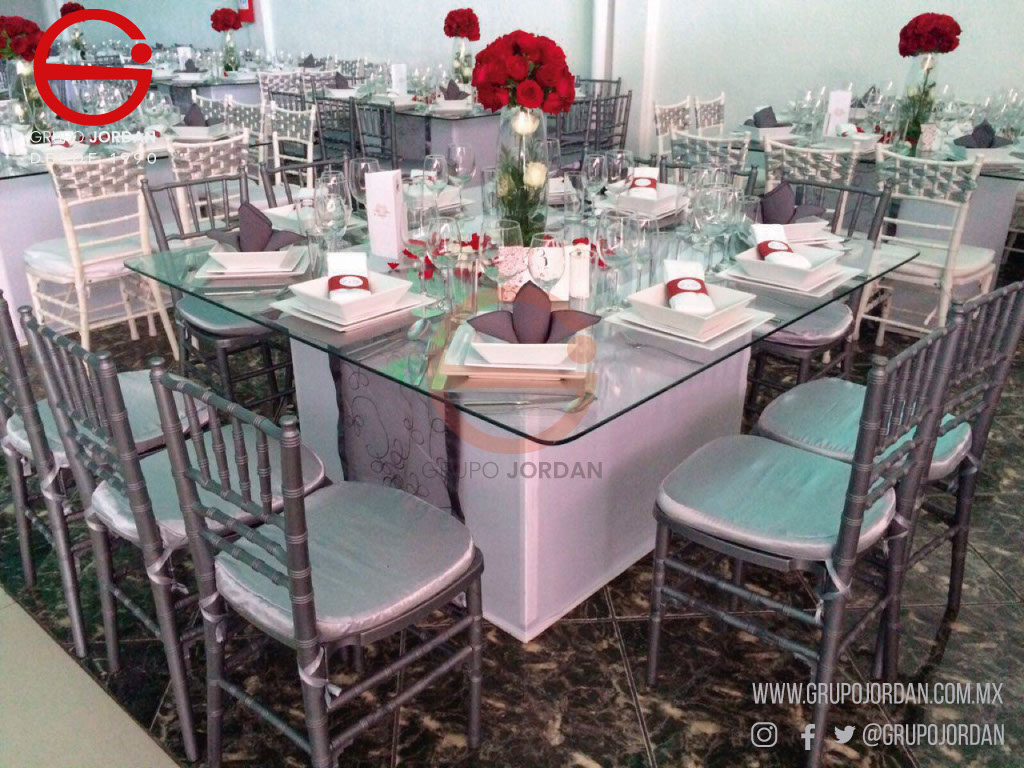 No encontrarás mejores mesas de cristal en el mercado, un cristal grueso y delicadamente cortado para la comodidad y belleza de tu montaje.