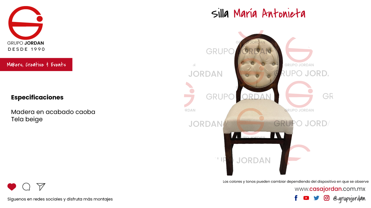 Nuestra Silla María Antonieta es una silla que guarda el estilo clásico, con un respaldo capitonado y estructura de madera con asientos acolchados es un modelo clásico y muy formal.
